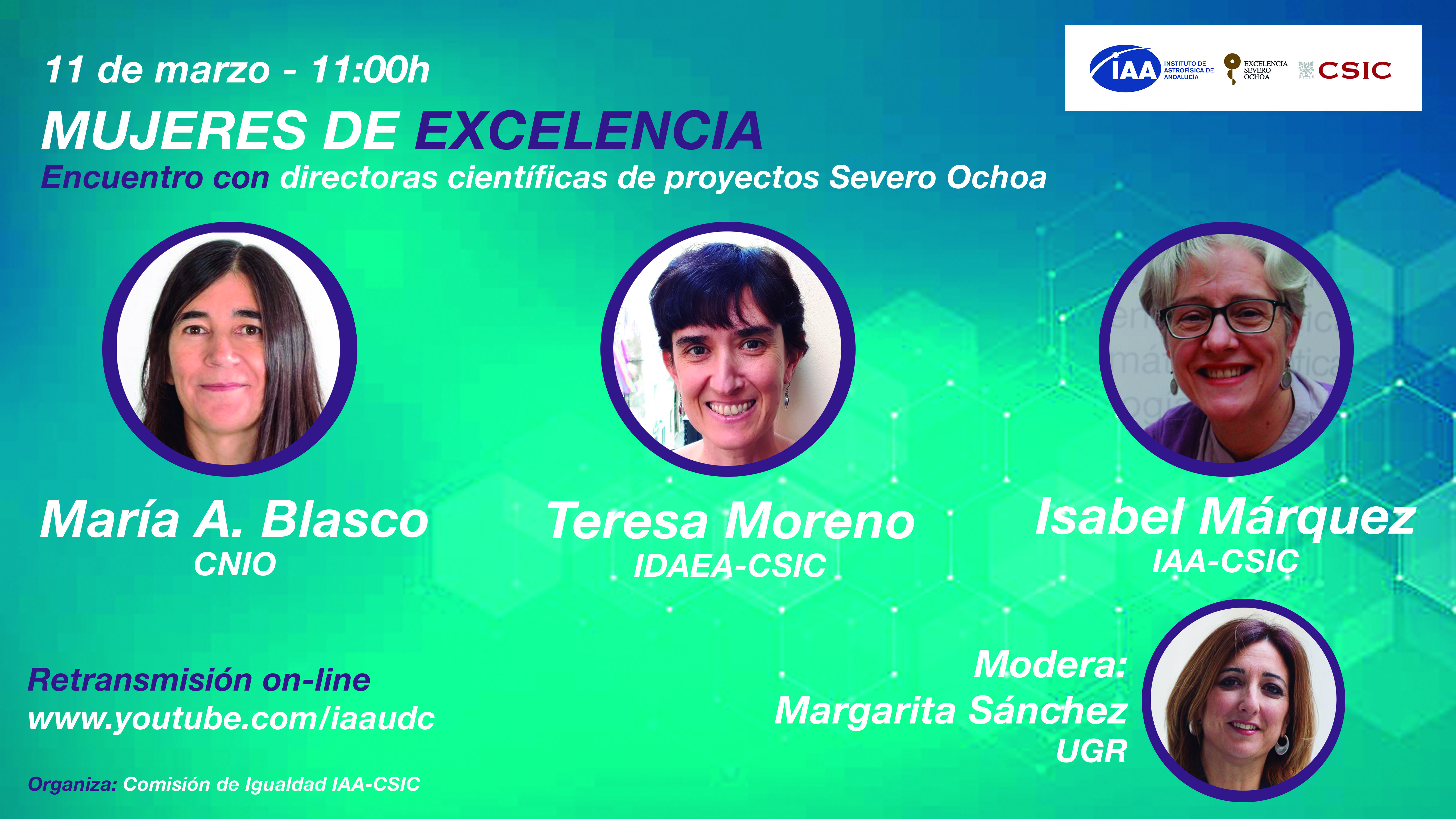 La directora del IDAEA, Teresa Moreno, participa en la mesa redonda "Mujeres de excelencia. Encuentro con directoras científicas de proyectos Severo Ochoa", organizada por el Instituto de Astrofísica de Andalucía (IAA-CSIC) en conmemoración del 8 de marzo, Día Internacional de la Mujer. Idioma del evento: Castellano