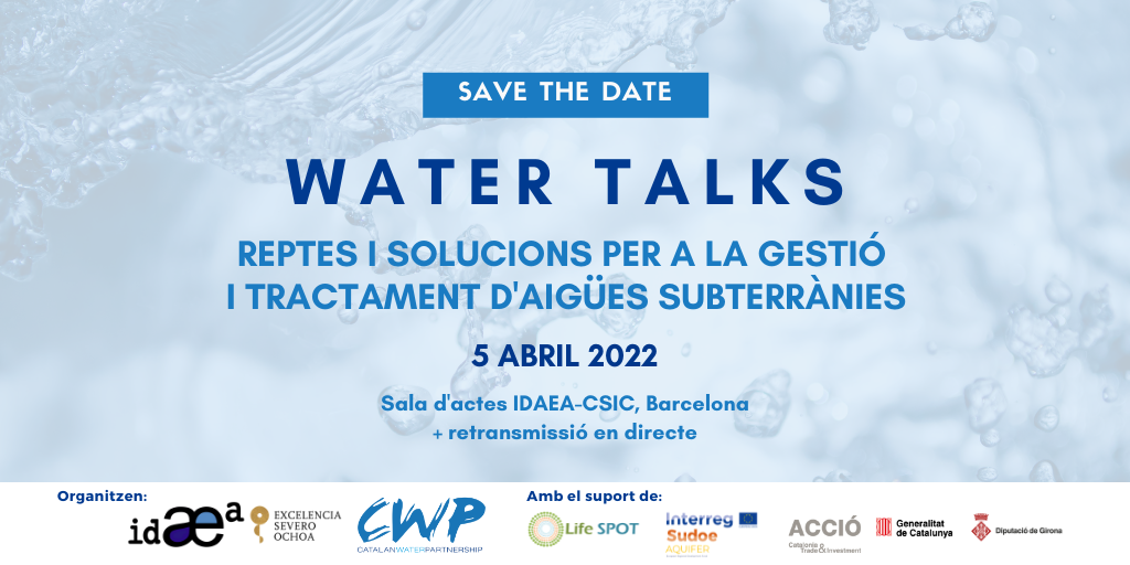 La 4a edició de WATER TALKS, organitzada pel Catalan Water Partnership i l'IDAEA-CSIC, estarà focalitzada en les aigües subterrànies amb experts del sector per conèixer els reptes, tendències actuals i projectes d'I+D i solucions per a millorar la eficiència tant en la gestió com en el tractament de les aigües subterrànies. Esdeveniment híbrid: YouTube IDAEA i Sala d'Actes. Idioma: català.
